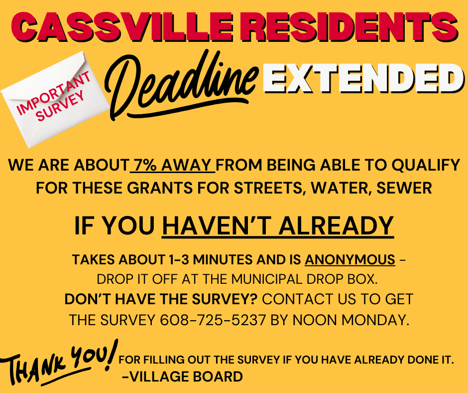 If you haven’t already completed the Village of Cassville survey, we need your help. (The survey was mailed or dropped off by the Village. It is not an online survey.) We are very close to qualifying for important grants that would fund:
